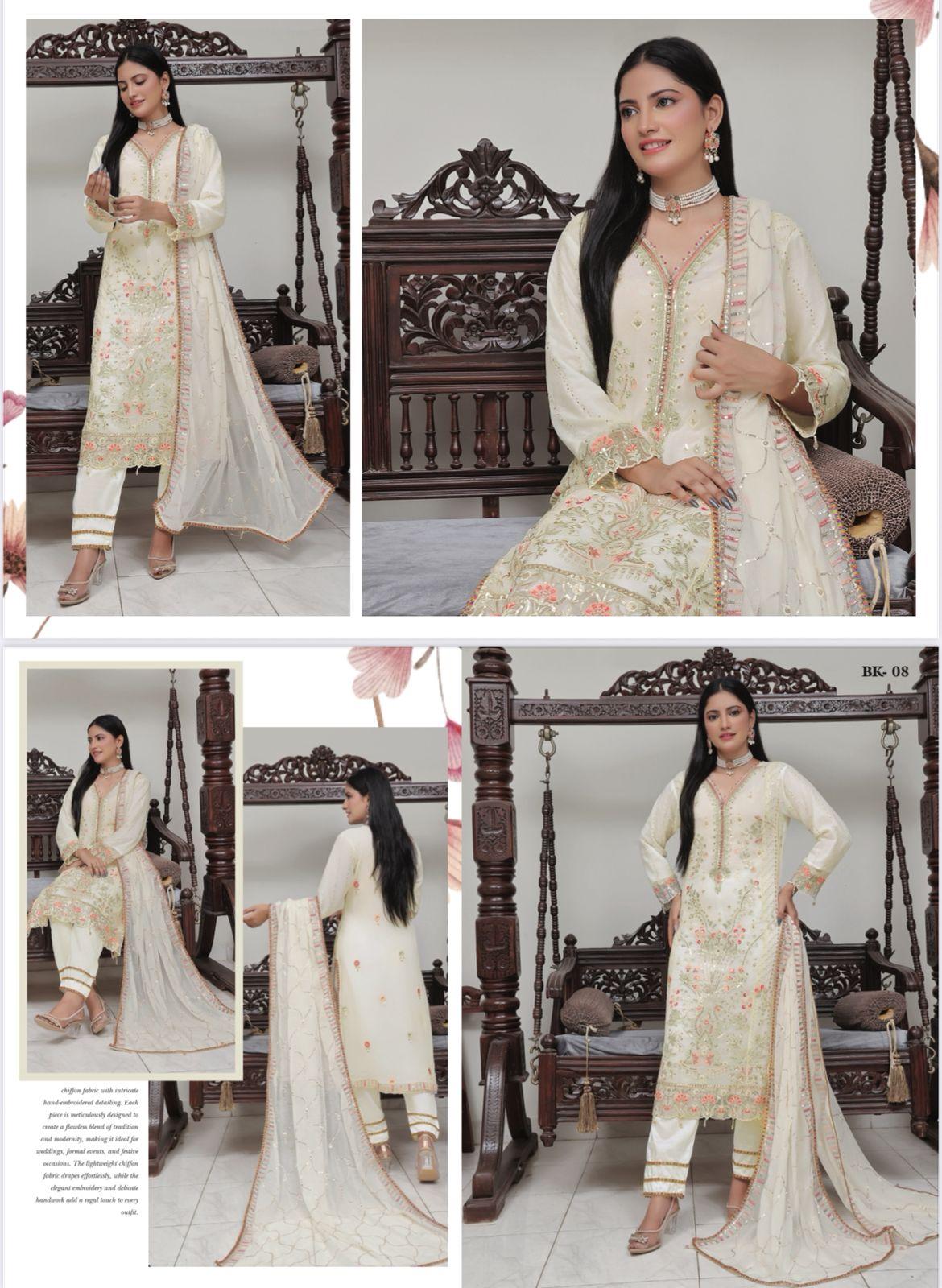 This elegant Pakistani dress features a beautifully designed kameez paired with a matching shalwar and dupatta. Crafted with premium fabric and delicate detailing, it offers both comfort and style—perfect for festive occasions or graceful everyday wear.
